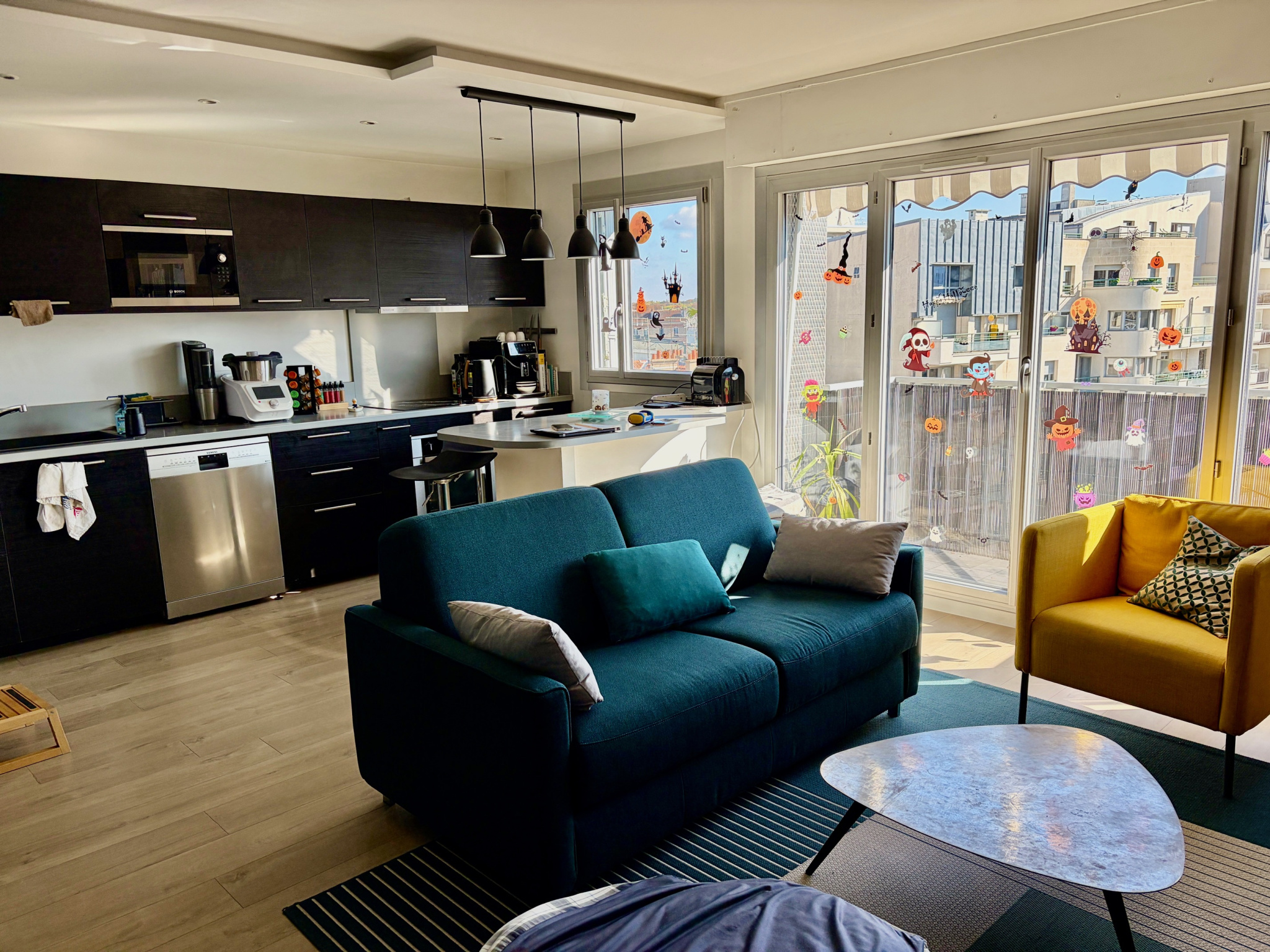 Charenton-le-Pont (94220)Exclusivité, Charenton le Pont proche métro Charenton écoles , commerces et bois , dans un immeuble récent avec interphone, gardien, ascenseur, superbe appartement 3 pièces en dernier étage (7éme et dernier pas de voisin au-dessus) composé d’une petite entrée avec penderie , un très bel espace de réception (salon salle manger) d’environ 30 m2 avec parquet et cuisine ouverte équipée donnant sur balcon avec vue dégagée sans aucun vis-à-vis, soleil, appartement refait complètement en 2017, double vitrage, volets électriques, un petit coin bureau avec rangement , wc séparé, salle de bain avec coin machine, 2 chambres avec parquet et porte fenêtre, calme, cave et un très grand emplacement de parking .
